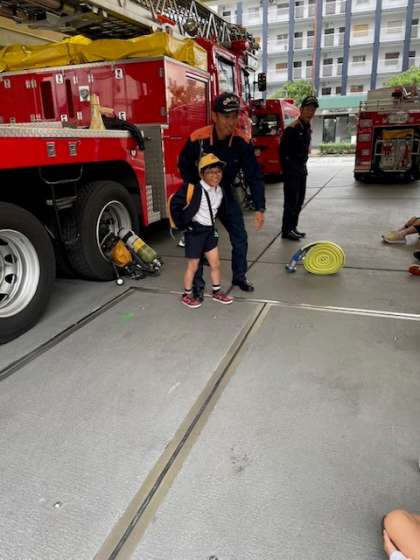 万が一に備え、消防隊の方々は日ごろからたくさん訓練を積まれていて、とても力持ちです。隊員の方は子どもたちの体をすっと抱えて、素早く軽々と運びます(^^♪