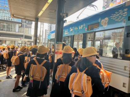 路面電車(広電)に乗って記念公園へ向かいます。人数が多いので2グループに別れての移動です。