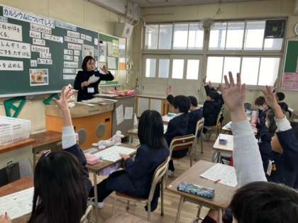 2組です。栄養教諭の先生と一緒に、私たちの強い骨を作るカルシウムについて学習しました(^-^)/