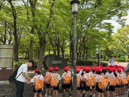 大阪城公園に入り,まずは大阪砲兵工廠跡に向かいました。平和学習の一環で大阪城公園にある戦争に関連する跡地などを見て回ります。