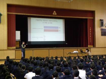 児童朝会時、2学期末に実施した児童アンケートの結果について溝口先生からお話がありました。