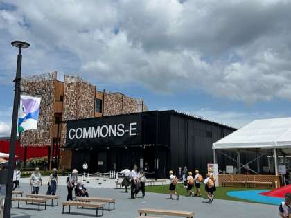 6年生が子ども優先電車に乗って、国際博覧会の会場である夢洲駅に到着し、会場入りしました。