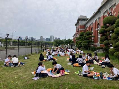 記念館の芝生の上で、お楽しみのお弁当です♪