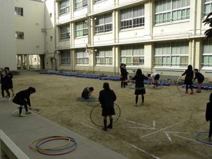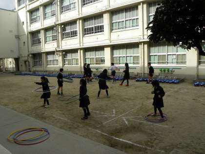 低学年も遊んでいますが、最近、特に高学年がフープを使っていろいろな遊びを考えています。