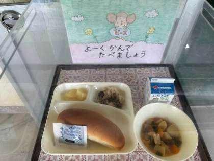 本日のメニューは、「コッペパン・ブルーベリージャム・牛乳・金時豆の中華おこわ・まる天野菜のうま煮・パインアップル(缶)」でした。