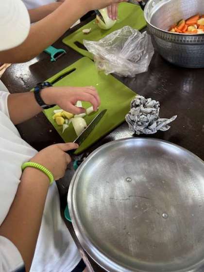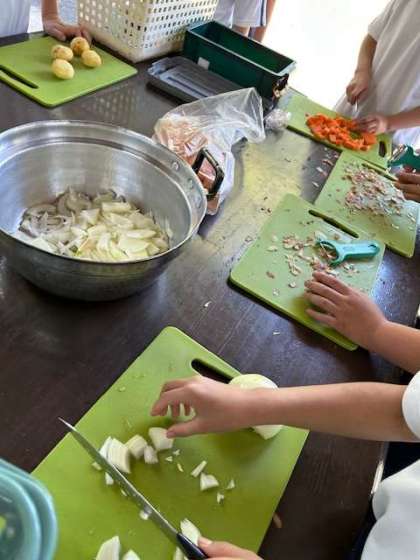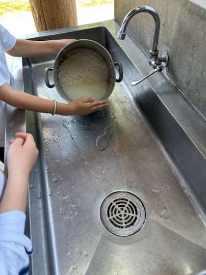 調理担当は、野菜を切ったり、米を研いだりして、それぞれの役割にがんばって取り組んでいます。