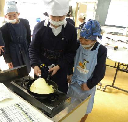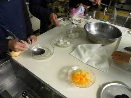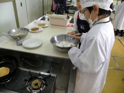 5年生の調理実習は「フルーツ白玉だんご」と「ホットケーキ」でした。