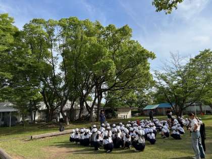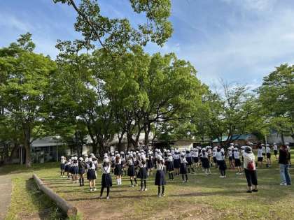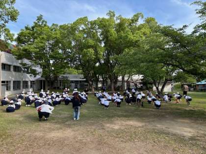 教頭先生の話の後、朝の体操です。体を動かし、すっきり目覚めて次の活動に備えます。