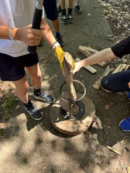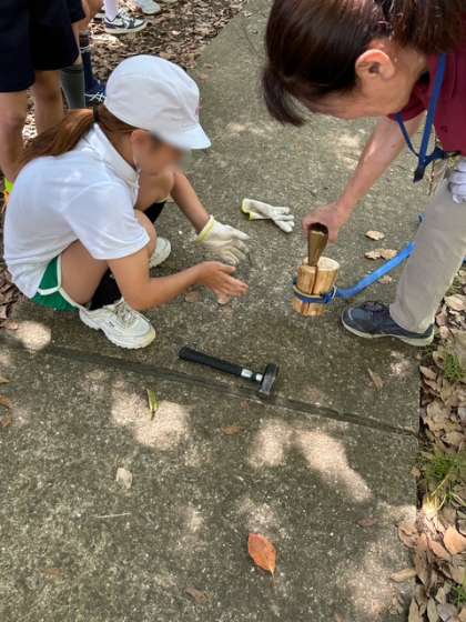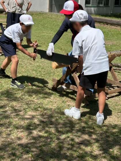 三種類の方法で薪を割っていきます。クラスごとに一種類ずつ交代して体験していきます。