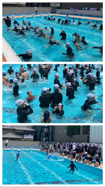 6年生と1年生が一緒にプール交流を行いました♪1年生との活動の中で、6年生はみんなお手本としてたくさん活躍しましたが、途中、先生の指示で1年生に水をかけられる場面もあり、子どもたちも先生たちも笑顔いっぱいの時間を過ごすことができました(^-^)
