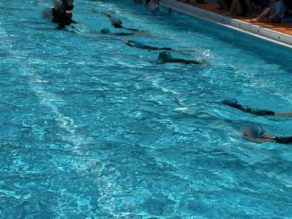 晴天の中、2年生はプール水泳で、水慣れ、けのびをしました。しっかりかべを蹴って伸びるかたちを練習しました。