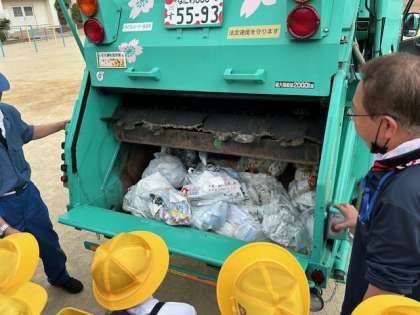 授業やごみ焼却工場の見学をして、しっかり学んできている4年生は、ごみを運んでくれる収集車を間近に見て、実際にごみが収集車に入る様子なども見てさらに学ぶことができました。