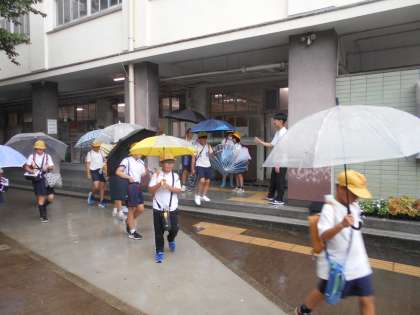 下校予定時刻にたくさんの雨が降る予報もあり、準備ができた学級から随時下校をしました。7月で離任する先生と別れを惜しむ子どもたちの思いが、ひょっとしたら天気に影響したのかもしれません。