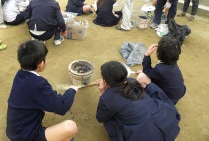 みんなで「煙たい、煙たい」と言いながら七輪に火をおこしました。