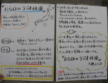 「東日本大震災」から5年がたちました。「おらほのラジオ体操」を通して、東北を身近に感じたいです。東北の人たちの元気な姿を思いながら今週は私たちも元気に「おらほのラジオ体操」をしましょう。
