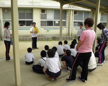 そのあと、「なかよし花壇」に植えるさつまいもと大豆の水やり当番をきめ、花壇で水のやり方の説明を聞きました。