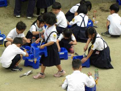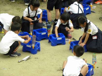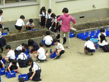 一人ひとりが自分の鉢に土と肥料を入れ種をまきました。水もたっぷりやりました。