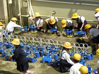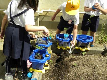 2年生は生活科の学習でミニトマトを育てます。今日は植木鉢にトマトの苗を植えました。植えた後、生活科のプリントに苗の様子を記録しました。