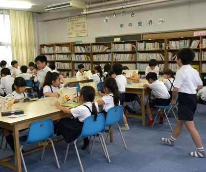 本を選び、本を読んだり、紙芝居の練習をしたりしています。貸し出しもしています。