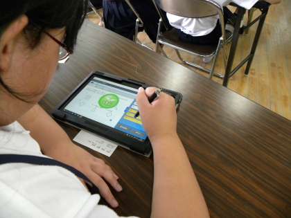 6年生はデジタルドリルを使って1学期の算数の復習をしました。自分の苦手な分野を選び問題を解いていきます。正解すると「ピンポーン」と音が鳴り次の問題に挑戦します。一人ひとりに応じた問題を解くことができます。