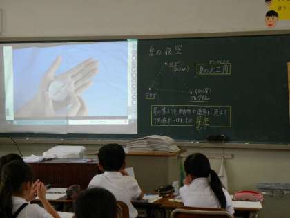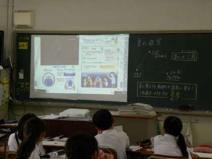 4年生は「夏の夜空」の学習をしています。夏休みに家庭で夜空の観察をする宿題が出ています。観察するためには方位磁石を使います。今日は、スクリーンに映し出された「方位磁石の使い方」の動画を見ながら学習しました。大きく詳しい動画は分かりやすいので効果ありました。