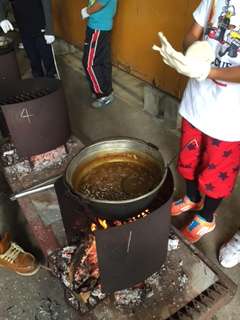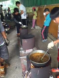 かまどでは、暑さと煙と灰に悪戦苦闘!目が痛いなあ。