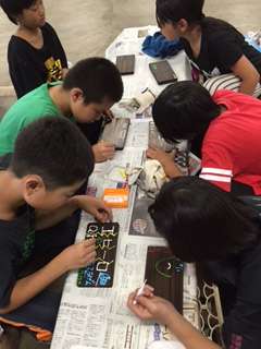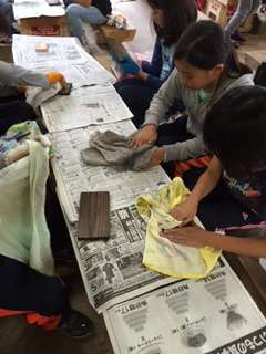 焼いた板のすすをとり、林間学習の思い出を絵や文字で表しました。おうちへのお土産です。