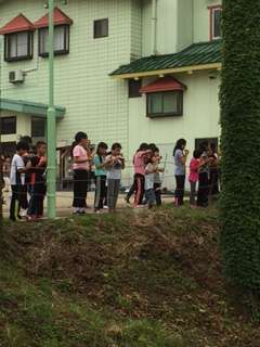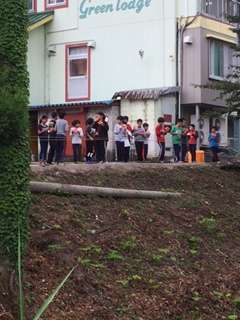 宿舎の前に並んで種とばしを競いながらのおやつでした。