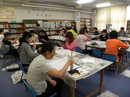 6年生の教材「墨アート」の基礎基本をを指導していただきました。墨の不思議さや可能性を知り、私たちの指導力の幅が広がりました。
