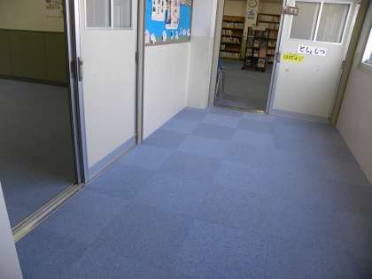 図書室前廊下の図書スペースと図書準備室の床にカーペットが貼られました。