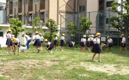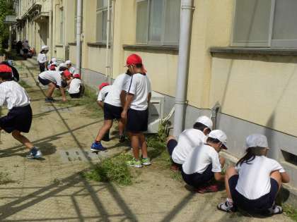 今日は校内美化日です。学年ごとに雑草抜きをしました。汗をかきながらの作業でした。