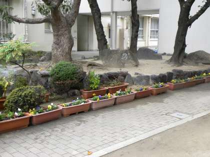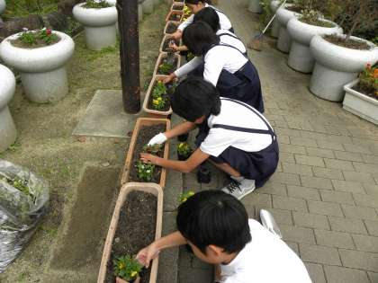 栽培委員会の人たちが秋の苗をプランターに植えました。正門あたりはすっかり秋の装いになりました。