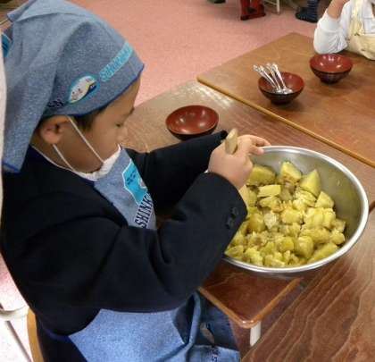 おいもの歌やおいもクイズを楽しみ、収穫したおいもで茶巾しぼりをつくりおいしく食べました。