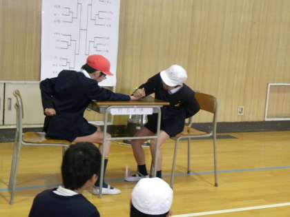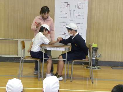 「腕ずもう」「指ずもう」男女混合の対戦です。
