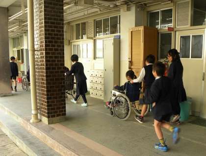 「車いすに乗って押してもらう」「車いすを押す」の体験を交替で行いました。