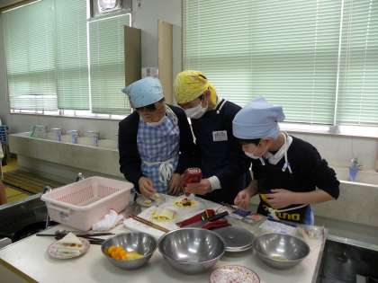 6年生の家庭科調理実習です。サンドイッチを作りました。具材は卵、ハム、きゅうり、じゃがいも、ツナ、イチゴ、缶詰みかん、バナナ、生クリーム、チョコシロップなどからグループで相談して決めています。