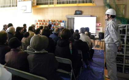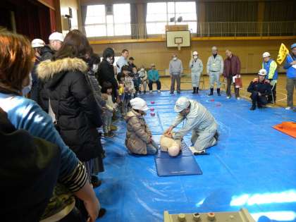 講堂では「南海トラフと地震のDVDの上映」「災害救助資材の展示」「救急救命の説明」「あっぱ君操作の体験」がありました。