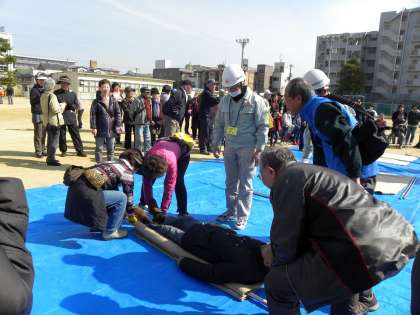簡易タンカーの体験です。物干しざおのような長い棒2本と毛布で簡易タンカーができ、人を運ぶことができます。