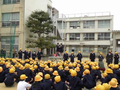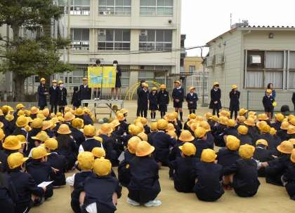 健康員会は2月の「ハンカチ、ティッシュ、爪調べ」の結果の発表をしました。その後、健康あるある体操を委員会全員で歌い、ハンカチ、ティッシュの携帯の大切さをを伝えました。