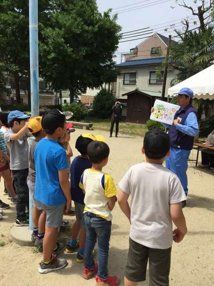 1部では鶴見緑地公園事務所の方から公園の遊具の安全な使い方を紙芝居をして教えてくださいました。