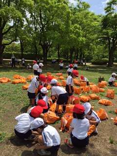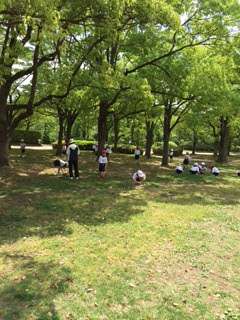 広い芝生で鬼ごっこや草摘みをしてあそんでいます。