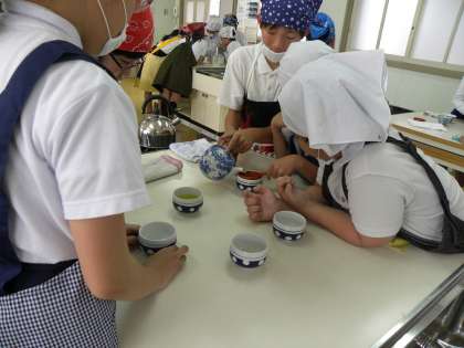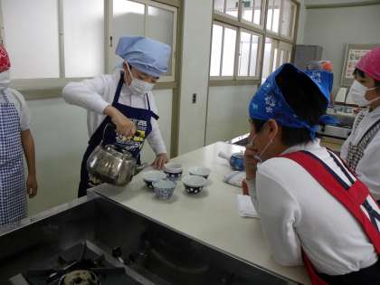 5年生は家庭科の学習で日本茶のおいしいいれ方を学習しました。お湯を沸かし、急須で煎茶をおいしくいれる実習です。