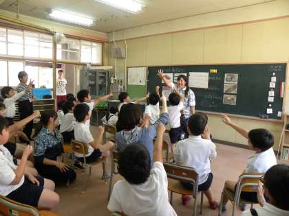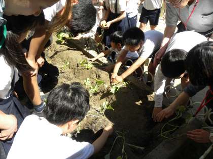 初めにさつまいものクイズをしたあと、学級園で一人ずつ苗をうえました。そして、また、教室に戻り「焼き芋じゃんけんポン」のゲームをして楽しみました。