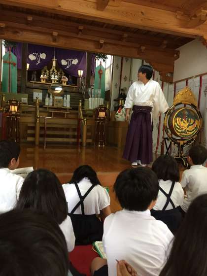今日は比枝神社で神主様にお話を聞きました。比枝神社は400年前に建てられたそうです。神社には神様へ感謝やお願いに人々が来られるそうです。万歳旗や太鼓、猿の置物についてもくわしく知ることができました。