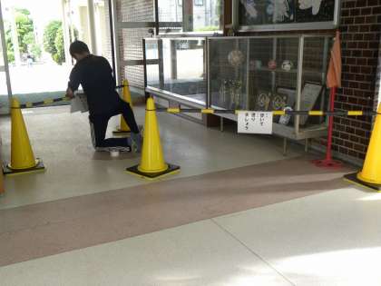 この場所はどうしても運動場へ出る時も運動場から教室へ帰るときも走ってしまいます。安全のための工夫です。