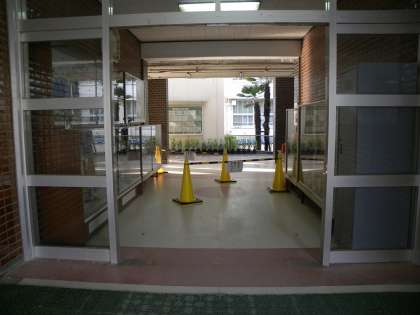 運動場から南校舎へ入るスペースにコーンと安全バーをジグザグに置いてみました。