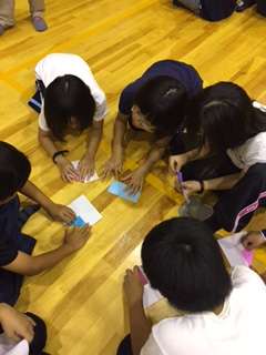 ナイトハイクのあと、体育館で紙飛行機飛ばし大会をしました。