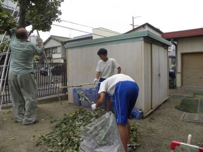 朝一番は塀の外回りのそうじを手伝い、その後は管理作業員さんが木の剪定をした枝や葉の後始末を手伝っていました。