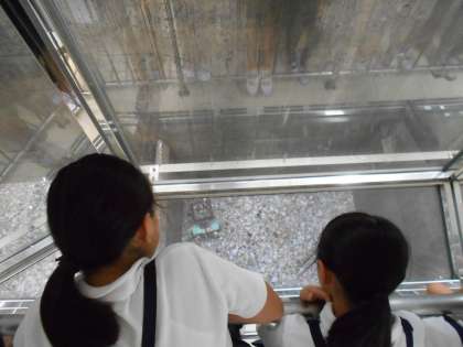 係の方のお話を聞いた後、工場内を見学しました。パッカー車で集められたごみを一度一か所に集め、そこから焼却炉に運ぶ「ピット」では、ごみの多さとクレーンの大きさに驚きの声があがりました。