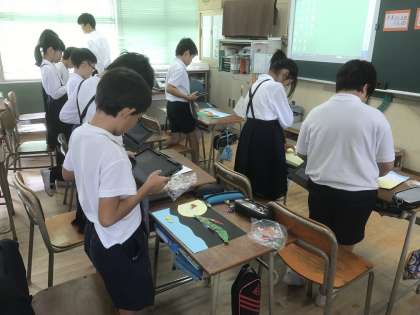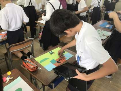 5年生の図画工作科で「コマコマ アニメーション」をつくっています。自分の表したい題材を少しずつ動かしつないでアニメーションにします。ひとつずつの動きをタブレットで撮影し、撮影したものをつなぎます。